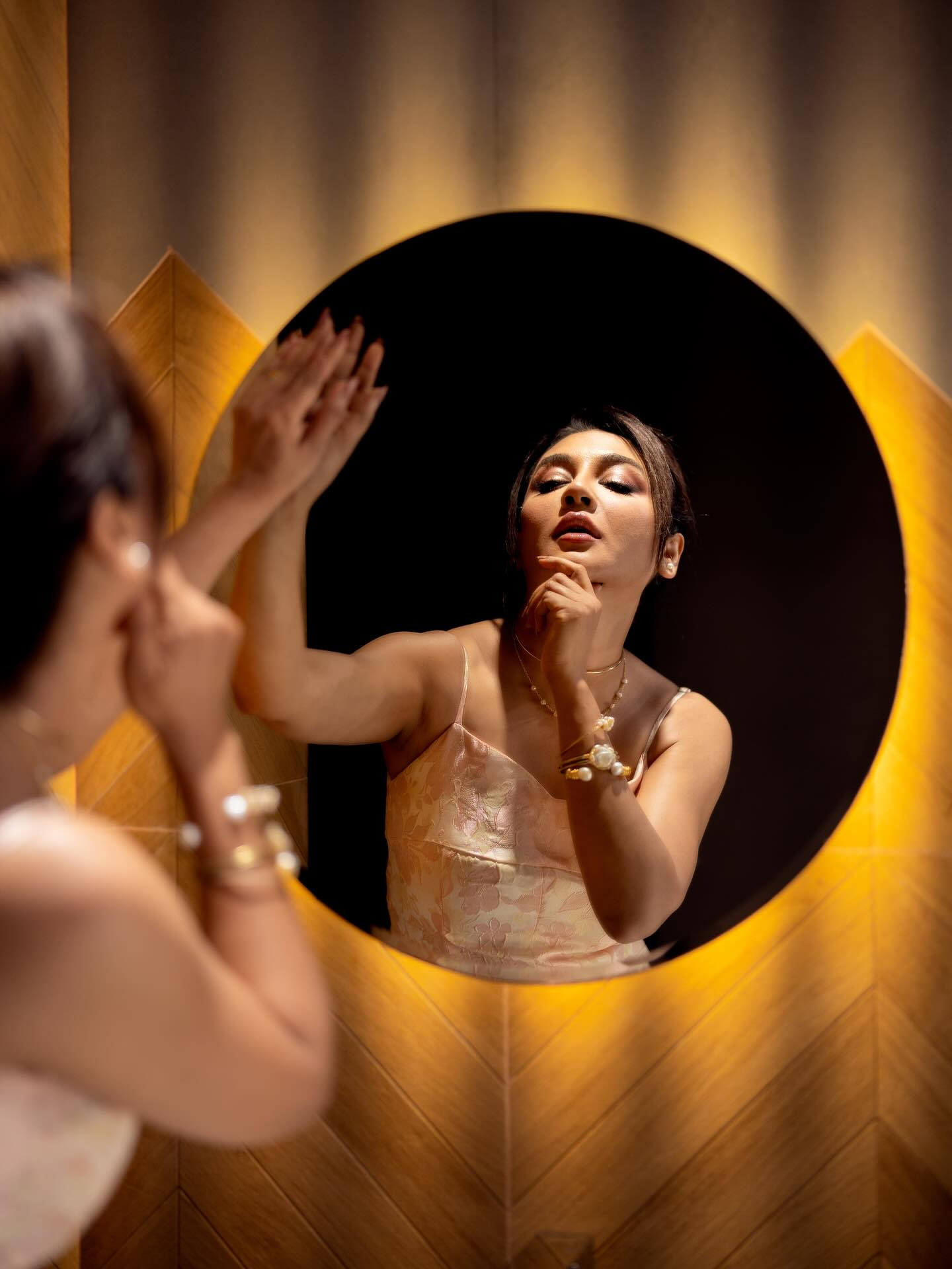 সেখানে দেখা যায়, অভিনেত্রী একটি হালকা সোনালি রঙের স্লিভলেস গাউন পরেছেন। মেকআপ রুমের আয়নার সামনেও পোজ দিয়েছেন তিনি। ফুটে ওঠে তার চোখের তীক্ষ্ণ চাহনি, যা আরও ভক্ত-অনুরাগীসহ নেটিজেনদের মনে নজর কেড়েছে।