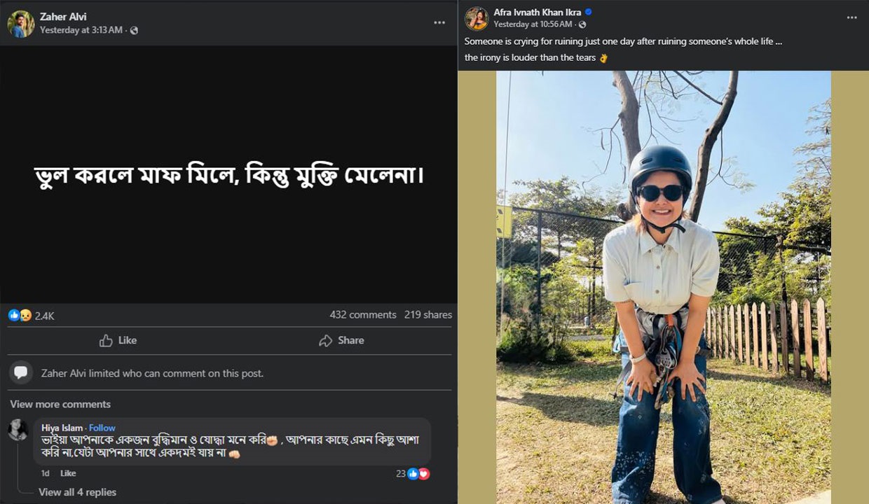 এ পোস্টের ঠিক কয়েক ঘণ্টা পর, শুক্রবার সকাল ১০টা ৫৬ মিনিটে ইকরা একটি হাস্যোজ্জ্বল ছবি দিয়ে ইংরেজিতে একটি ইঙ্গিতপূর্ণ স্ট্যাটাস দেন। সেখানে তিনি লেখেন, কেউ একজন কারও পুরো জীবনটা ধ্বংস করে দেয়ার পর নিজের মাত্র একটা দিন নষ্ট হওয়ার জন্য কাঁদছে... কান্নার চেয়ে এ পরিহাসের আওয়াজ অনেক বেশি তীক্ষ্ণ।