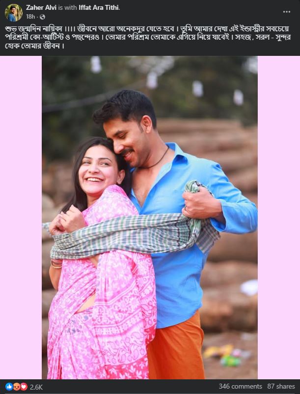 শুক্রবার তিথির জন্মদিন উপলক্ষে আলভী তার ভেরিফায়েড পেজে একটি ছবি শেয়ার করেন, যেখানে দুজনকে একটি গামছায় জড়ানো অবস্থায় বেশ ঘনিষ্ঠ ভঙ্গিতে হাসিমুখে দেখা যায়। ক্যাপশনে আলভী লেখেন, শুভ জন্মদিন নায়িকা। জীবনে আরও অনেকদূর যেতে হবে। তুমি আমার দেখা এ ইন্ডাস্ট্রির সবচেয়ে পরিশ্রমী কো-আর্টিস্ট ও পছন্দেরও।