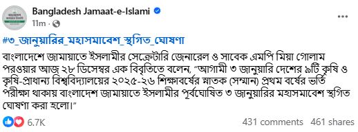 পোস্টে বলা হয়, বাংলাদেশে জামায়াতে ইসলামীর সেক্রেটারি জেনারেল ও সাবেক এমপি মিয়া গোলাম পরওয়ার রোববার এক বিবৃতিতে বলেন, ‘আগামী ৩ জানুয়ারি দেশের ৯টি কৃষি ও কৃষি-প্রাধান্য বিশ্ববিদ্যালয়ের ২০২৫-২৬ শিক্ষাবর্ষের স্নাতক (সম্মান) প্রথম বর্ষের ভর্তি পরীক্ষা থাকায় বাংলাদেশ জামায়াতে ইসলামীর পূর্বঘোষিত ৩ জানুয়ারির মহাসমাবেশ স্থগিত ঘোষণা করা হলো।’
