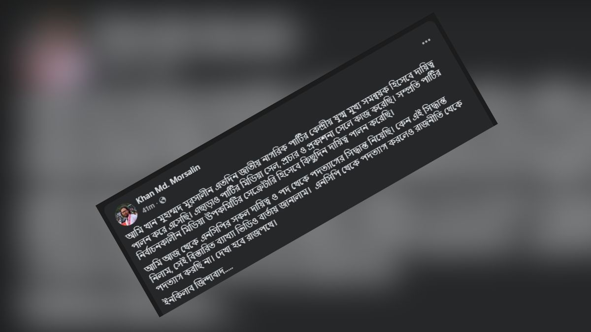 তিনি ফেসবুকের এক পোস্টে লেখেন, আমি খান মুহাম্মদ মুরসালীন এতদিন জাতীয় নাগরিক পার্টির কেন্দ্রীয় যুগ্ম মুখ্য সমন্বয়ক হিসেবে দায়িত্ব পালন করে এসেছি। এছাড়াও পার্টির মিডিয়া সেল, প্রচার ও প্রকাশনা সেলে কাজ করেছি।