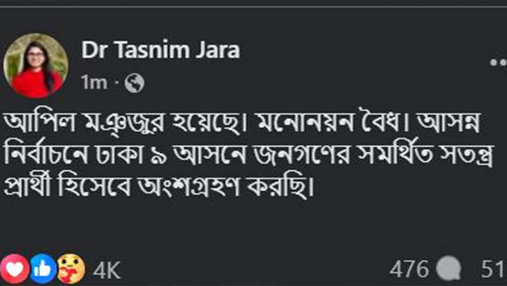 ত্রয়োদশ জাতীয় সংসদ নির্বাচনে ঢাকা-৯ আসনের স্বতন্ত্র প্রার্থী তাসনিম জারার মনোনয়নপত্র বৈধ ঘোষণা করেছে নির্বাচন কমিশন। এরপরই নিজের ফেসবুকে এ-সংক্রান্ত পোস্ট দিয়েছেন জারা।